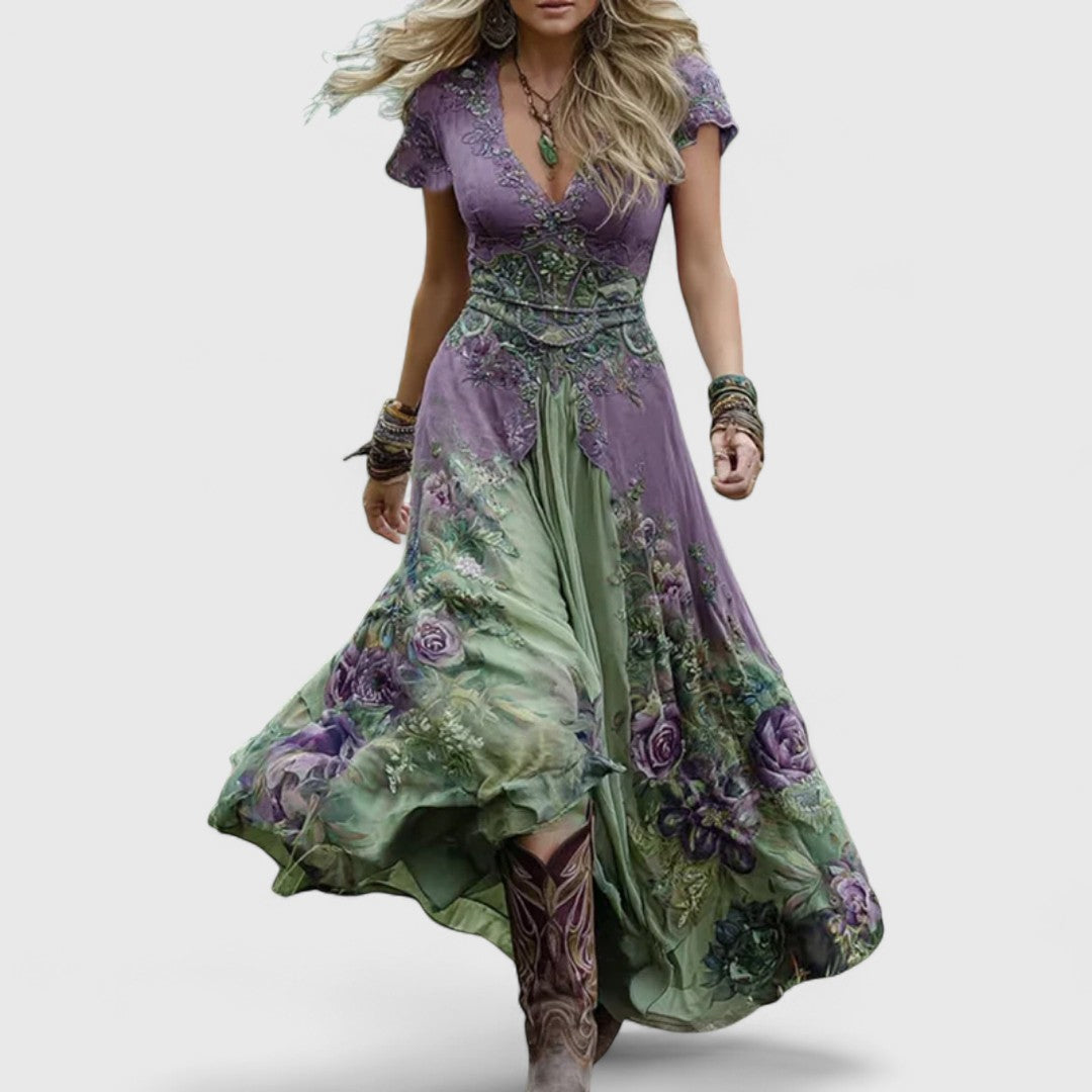 Лаодикия - Елегантна и свободна есенна рокля с цветни мотиви